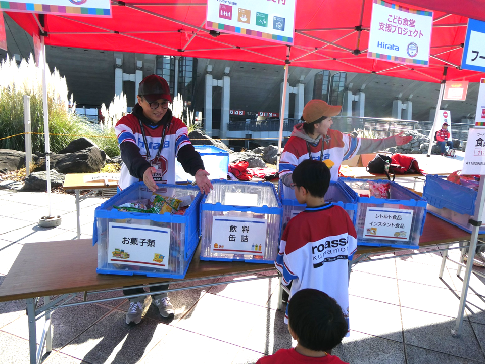 ロアッソ熊本と協力し、ホームゲーム会場でフードドライブを実施。ご来場の皆さまに食料品などの提供をお願いし、寄せられた品は地域の子ども食堂に寄付します。これにより、食品ロスの削減と地域の支え合いを目指しています。